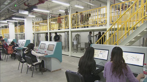 第三类:综合实训区,主要针对高年级学生设立,培养学生综合运用所学知识,分析问题解决问题的能力。该区域主要模拟工厂从合成、精制到下游包装、物流等全过程。要求学生已经掌握了基本的岗位技能后,各专业间相互配合的前提下,在此进行综合运用专业能力。